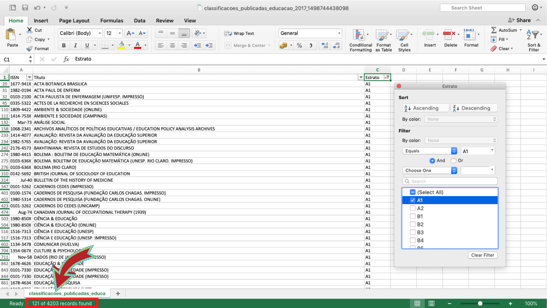 Vamos ser ambiciosos então: escolhemos o estrato A1 para publicação. Vamos filtrar na planilha que baixamos quantos periódicos tem a categoria A1.